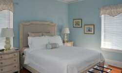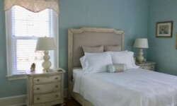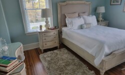 For those who really wish to indulge themselves, we offer this guest suite, with its own sizable separate sitting room with fireplace and a luxurious marble bathroom. This bathroom features a tub shower combination and a double vanity which has a black pearl leather granite countertop. Occupying the full length of the second floor, the suite, with a beautiful queen-sized bed, has the feeling of a small apartment as you enter the private hallway and see rooms to the left and right