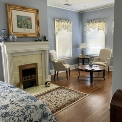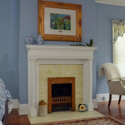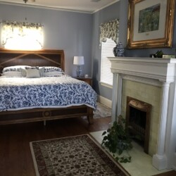 A large oil painting over the mantle by the celebrated French artist Jean-Claude Picot dominates this airy room, and the huge king-sized oak sleigh bed ensures sweet dreams. Relax with a book or go online in the charming sitting area. In this room, the original quarter sawn oak flooring has been beautifully restored. The bathroom features subway tile and a large walk-in shower with frameless glass doors and a vanity sink with granite countertop.