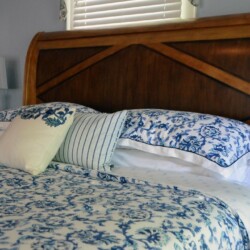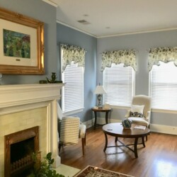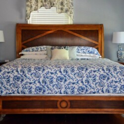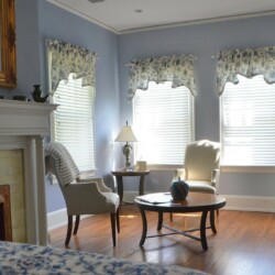 With five multi-paned sash windows on three sides, the light streams into the only guest room that extends the full width of the Across the Pond structure.